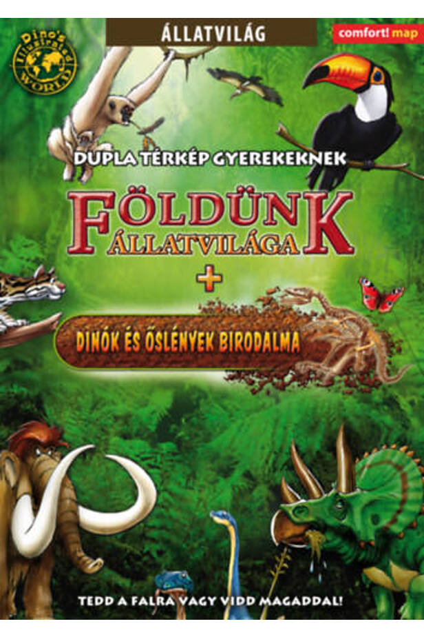 A kétoldalas kiadvány egyik oldalán földünk jelenlegi állatvilága, a másikon dinók és őslények kis rajzai lepik el a kontinenseket és óceánokat.